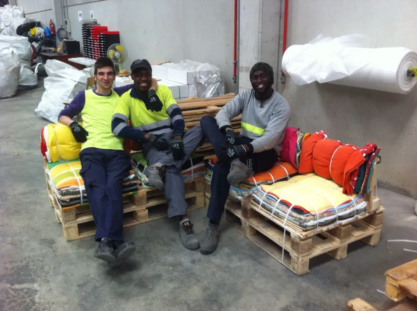 Colocamos las telas en los palés y las fijamos, para ello contamos con la inestimable ayuda de Yaya, el encargado de la prensa con la que tantas y tantas balas hacemos en Koopera.