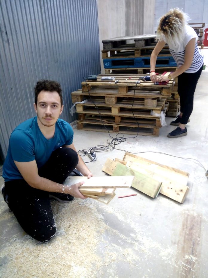 Desmontar los pallets, lijar las maderas, cortar y atornillar , tapizar, montar, y una vez que ya está todo de nuevo:  ¡A desmontar y prepararlo para enviar a Cáritas Bizkaia con un manual sencillo para su montaje!